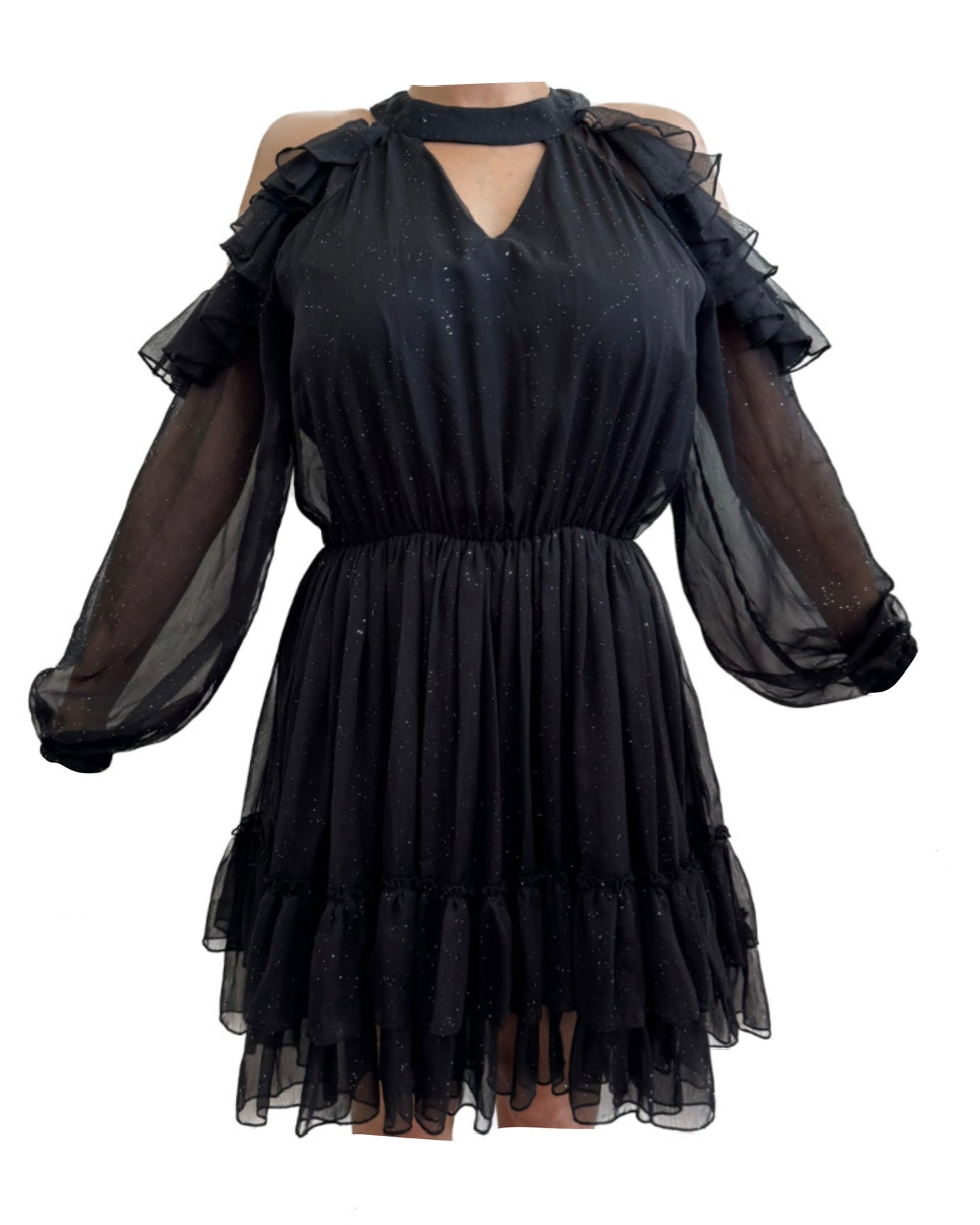 Upgrade your wardrobe with our Achers black glitter cold shoulder dress. With its subtle sparkle and on-trend cold shoulder design, this dress is perfect for any occasion. The high-quality fabric ensures a comfortable fit and the versatile style will make you stand out in any crowd.