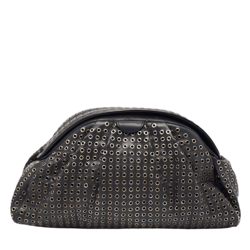 Expertly crafted from luxurious black leather, the Alaia Samia Eyelet Clutch is a must-have accessory for any elegant event. Its intricate eyelet detailing and sleek design make it the perfect complement to any outfit. With a spacious interior, it will effortlessly hold all of your essentials for a night out.