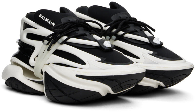 These Balmain Black and White Unicorn Low-Top Sneakers combine fashion and comfort in one sleek design. Made with high-quality materials, these sneakers provide durability and style. The black and white color scheme adds a touch of elegance, while the unicorn design adds a playful twist. Perfect for any fashion-forward individual looking to make a statement.