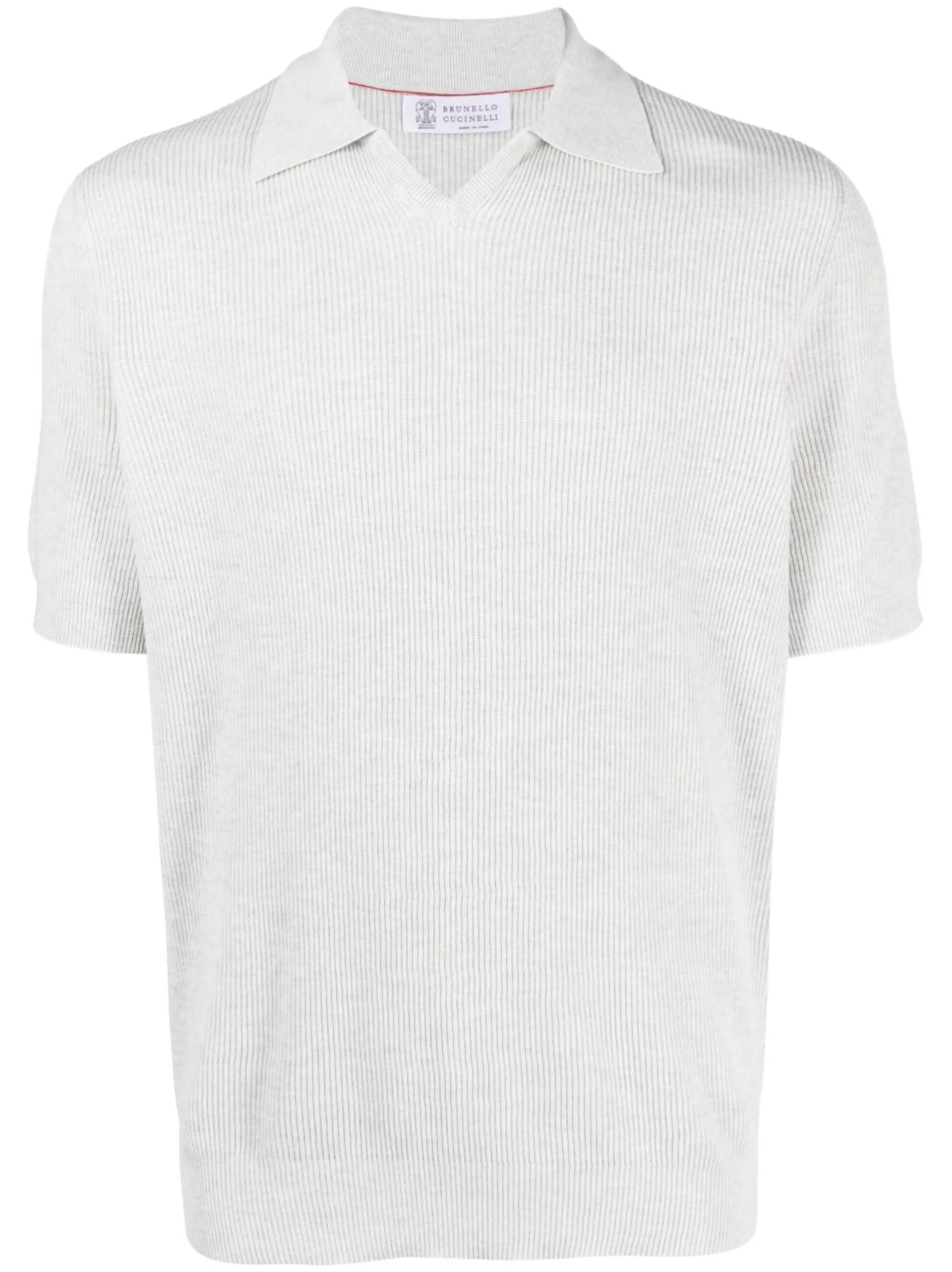 Expertly crafted by Italian luxury brand Brunello Cucinelli, this off white polo shirt features ribbed-trim for a sleek and modern look. Made with high-quality materials, it guarantees both style and comfort. Elevate your wardrobe with this timeless piece.