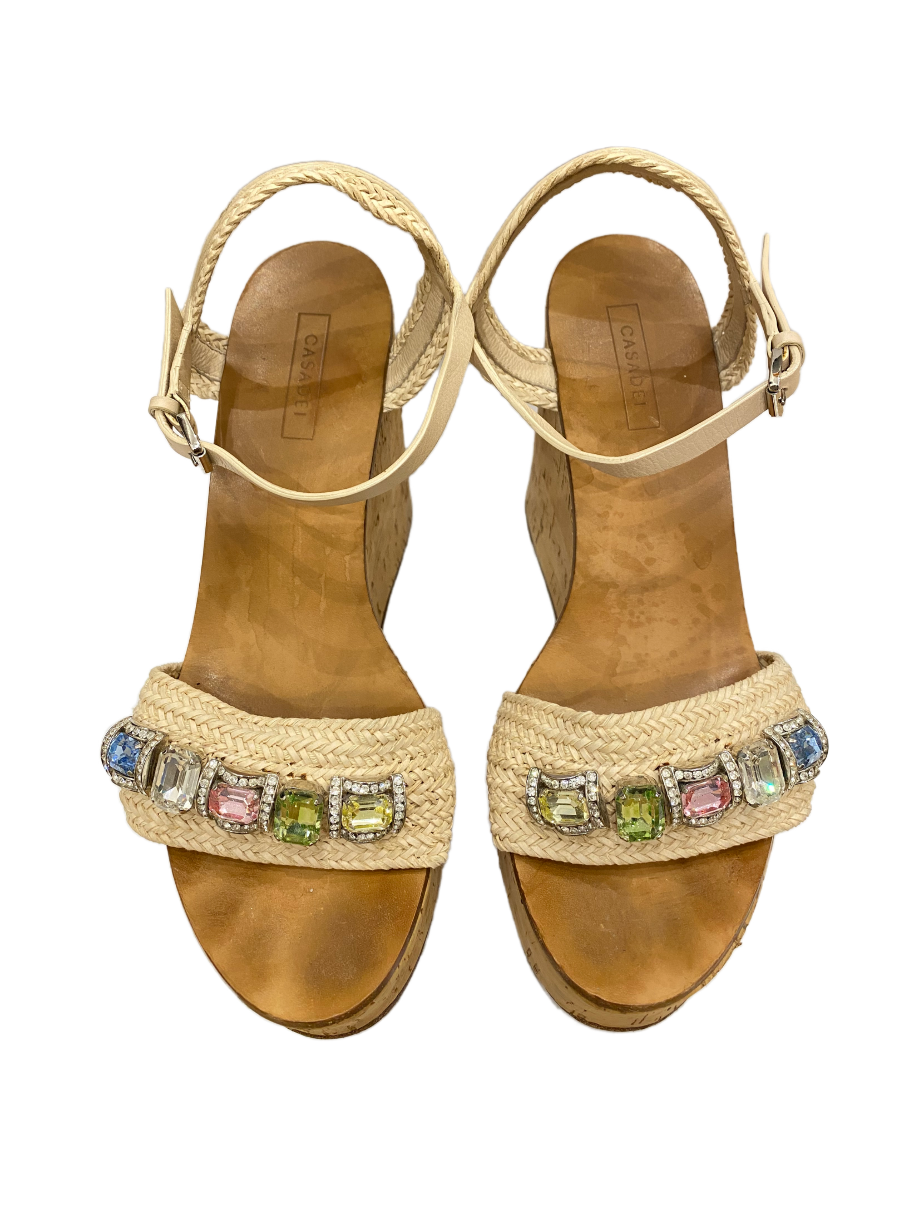 Elevate your style with these elegant Casadei beige wedges adorned with sparkling crystals. Crafted with luxurious materials, these wedges offer both comfort and glamour. Perfect for any occasion, these wedges add a touch of sophistication to any look. Get ready to shine in style with Casadei.