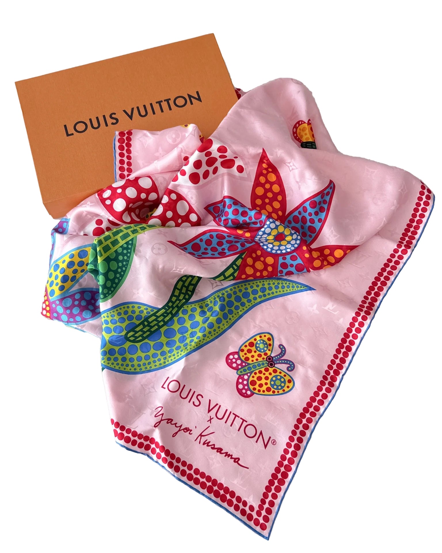 This limited edition Louis Vuitton x Yayoi Kusama scarf features a vibrant and eye-catching polka dot design. Made with high-quality silk, this scarf will add a touch of luxury to any outfit. With only a limited number available, it's a must-have for any fashion-forward collector.