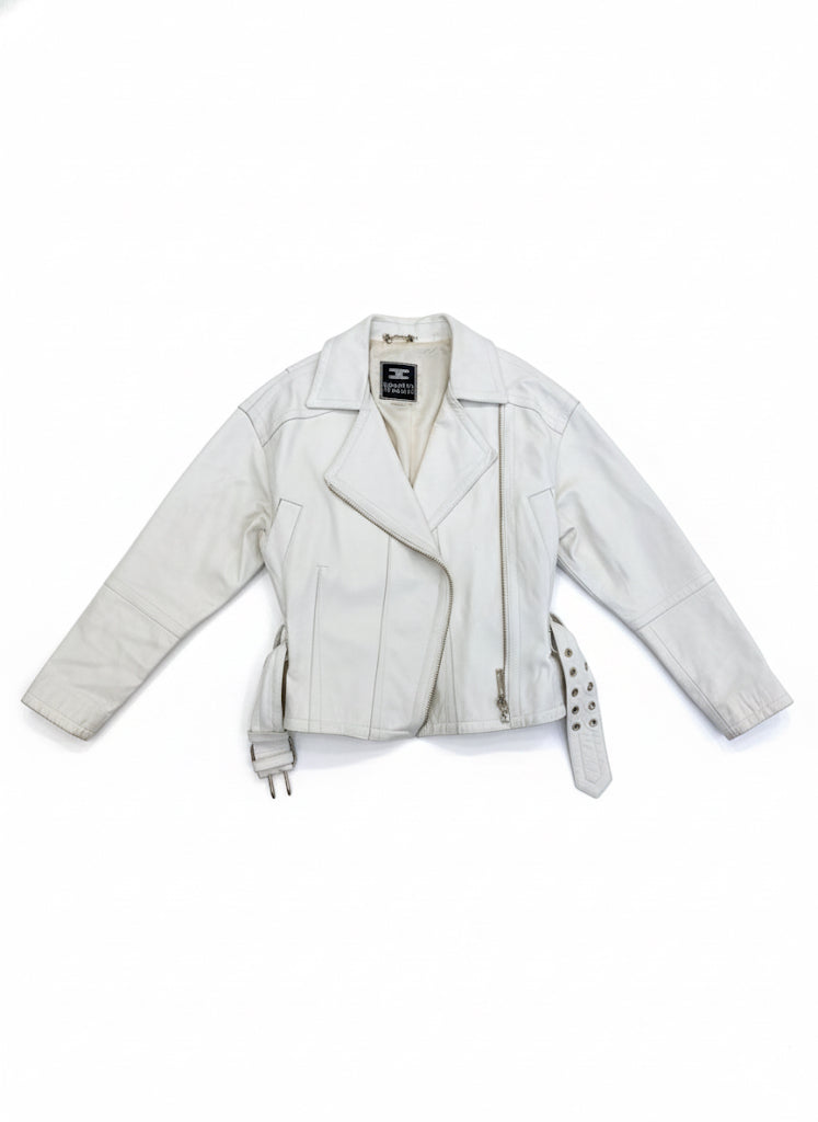 Crafted with the finest quality white leather, this Elisabetta Franchi jacket exudes timeless elegance and sophistication. Expertly tailored for a flattering fit, it features a classic design with modern details. The perfect addition to any wardrobe, this jacket will elevate any outfit and make a statement of effortless style.
