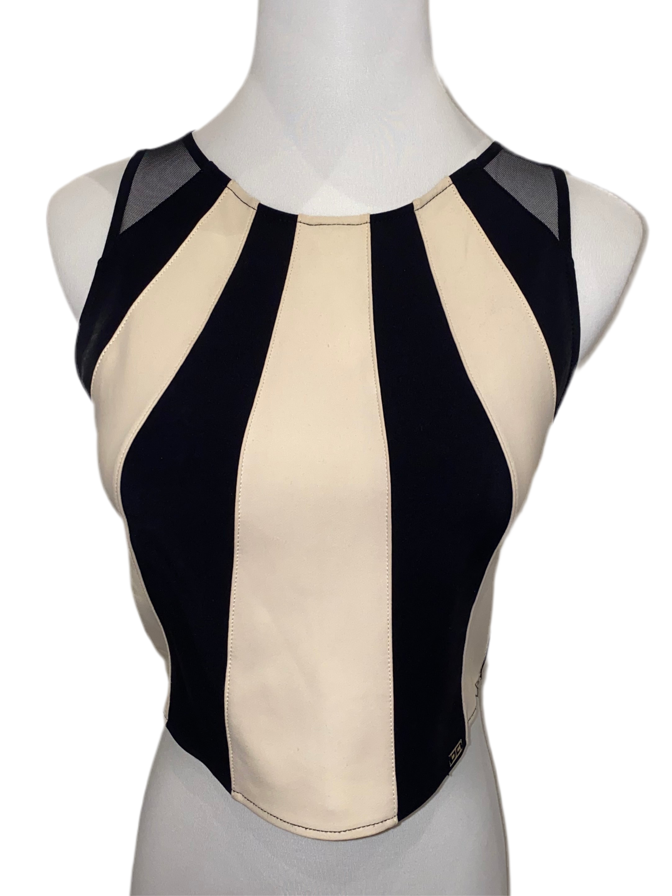 This Elisabetta Franchi black and beige back sleeveless top is a stylish addition to any wardrobe. The contrasting colors and unique design make it stand out from traditional tops, creating a modern and fashion-forward look. Crafted with high-quality materials, this top is not only visually appealing, but also comfortable to wear.
