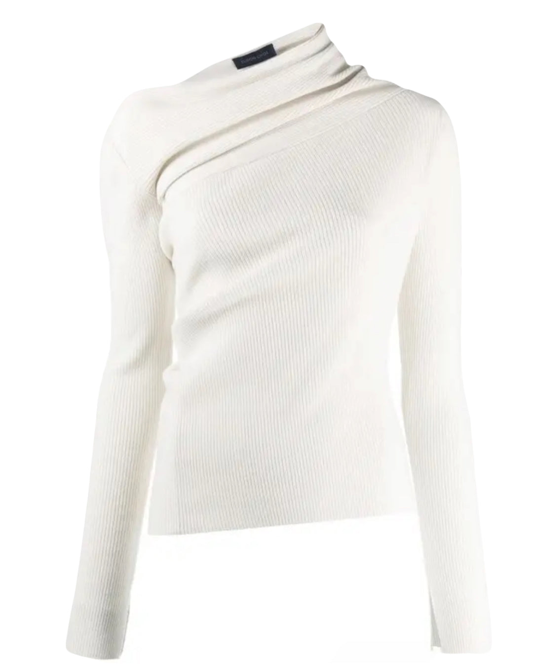 This EUDON CHOI Asyetric-Neck Knitted Sweater features an asymmetrical neck design and is made with high-quality knitted material. It provides a sophisticated and unique look while keeping you warm and comfortable. Expertly crafted by EUDON CHOI, a renowned fashion brand known for their attention to detail and quality.