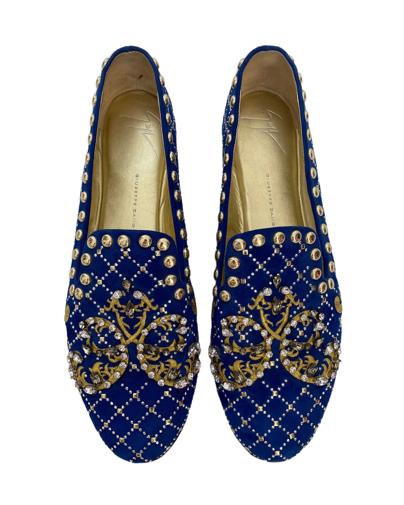 Crafted from luxurious blue suede, these Giuseppe Zanotti studded loafers are both stylish and comfortable. Featuring the brand's iconic stud detailing, these loafers are perfect for adding a touch of sophistication to any outfit. The slip-on style allows for easy and convenient wear, perfect for a busy lifestyle.