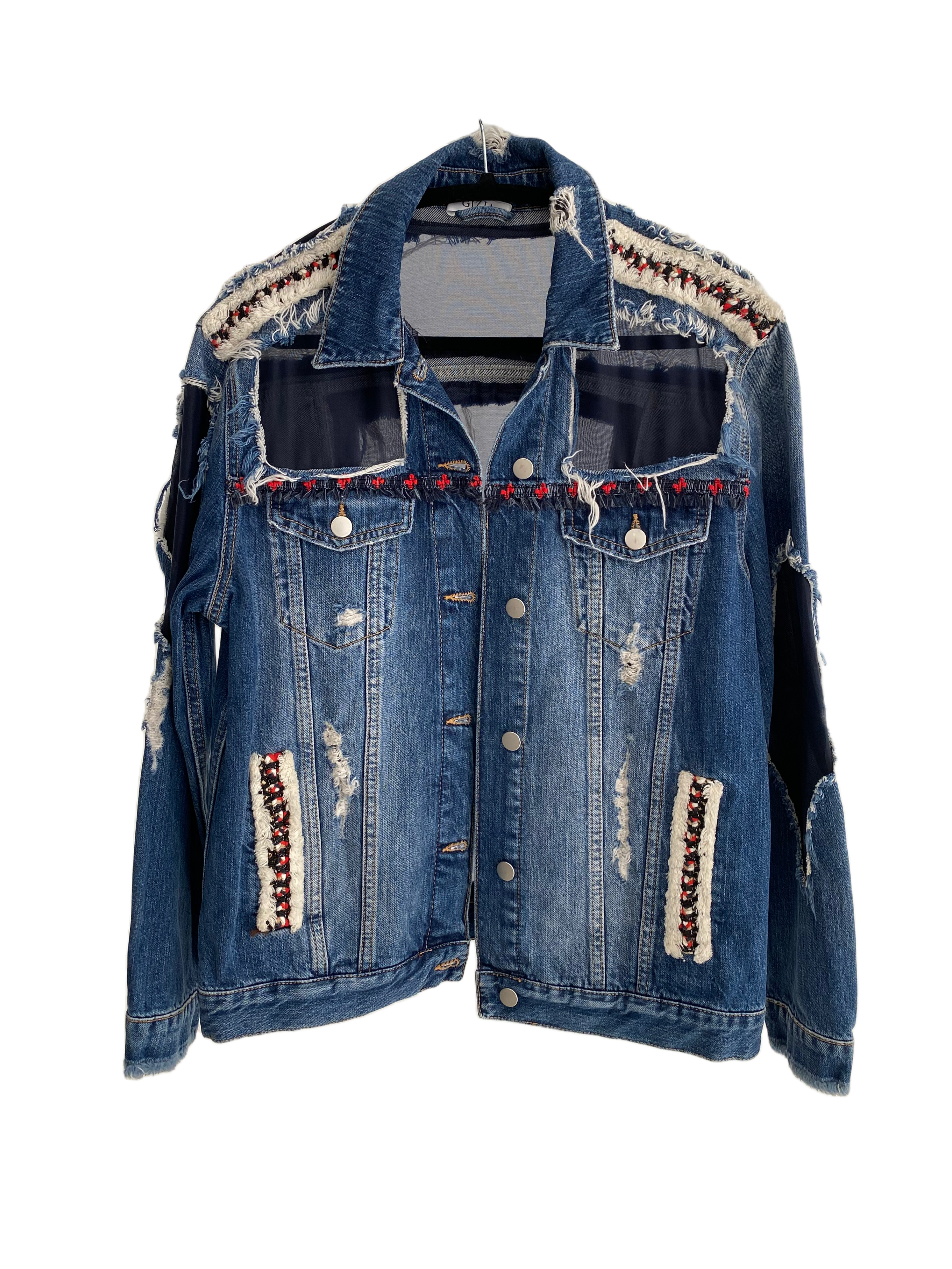 This Gizia Denim jacket features intricately embroidered details and mesh accents for a unique and stylish look. The high-quality denim material provides durability, while the added embroidery and mesh elevate the jacket's overall design. Perfect for adding a touch of elegance to any casual outfit.