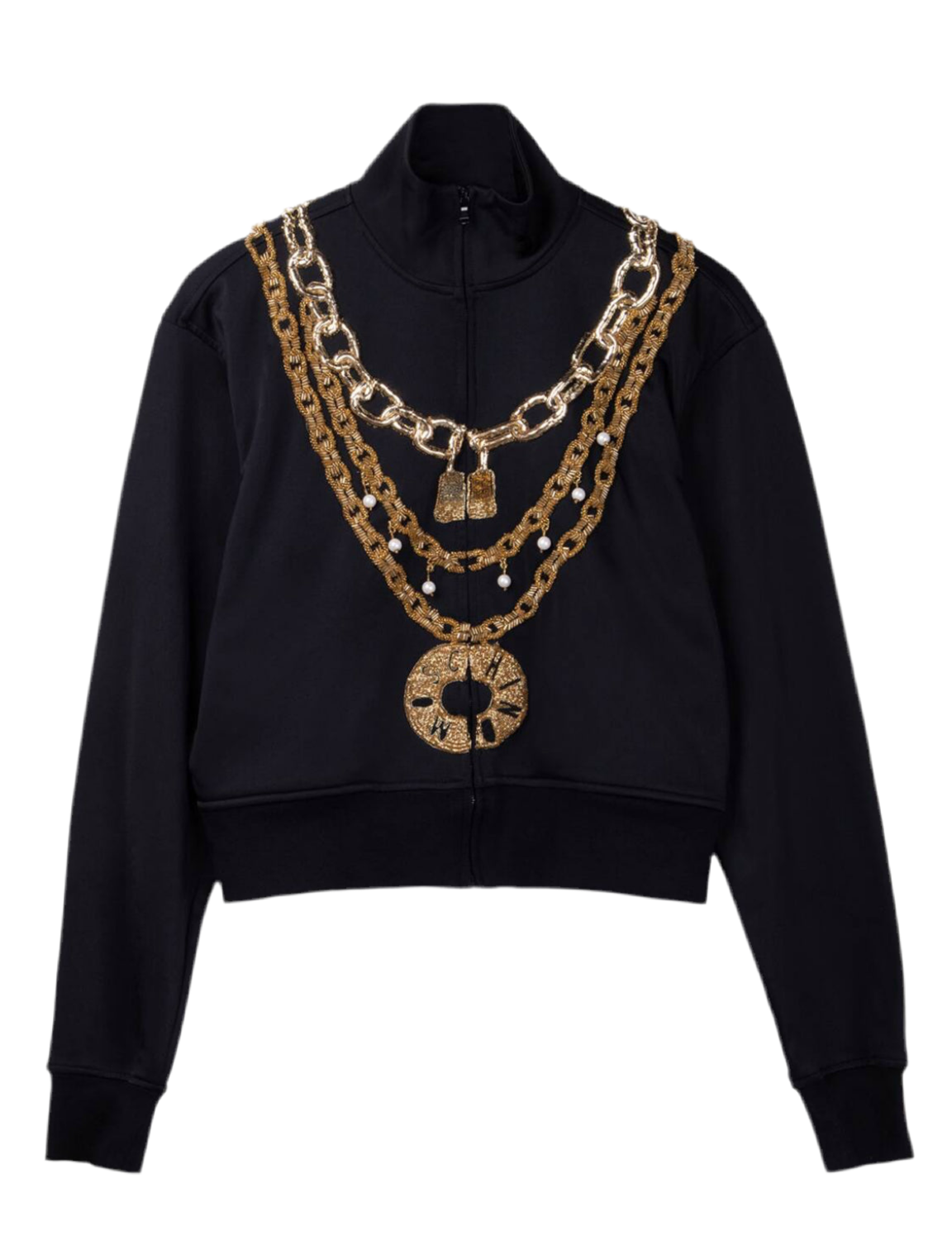 Upgrade your wardrobe with the H & Moschino black and gold chains jacket. This stylish and luxurious jacket features intricate gold chain details that add a touch of glamour to any outfit. Plus, the high-quality materials ensure long-lasting durability and comfort. Elevate your fashion game with this must-have piece.