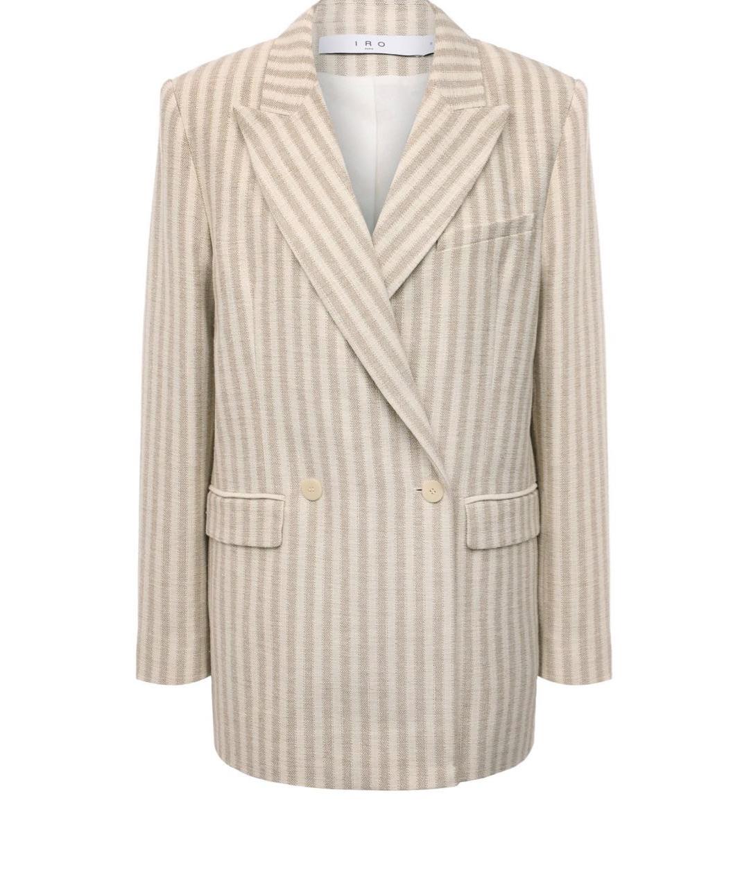 Stay stylish and polished in this IRO beige and white stripped blazer. Made from high-quality materials, it offers a perfect blend of comfort and sophistication. With its timeless design and versatile color, it is a must-have for any fashion-forward wardrobe. Elevate your look with this expertly crafted blazer.