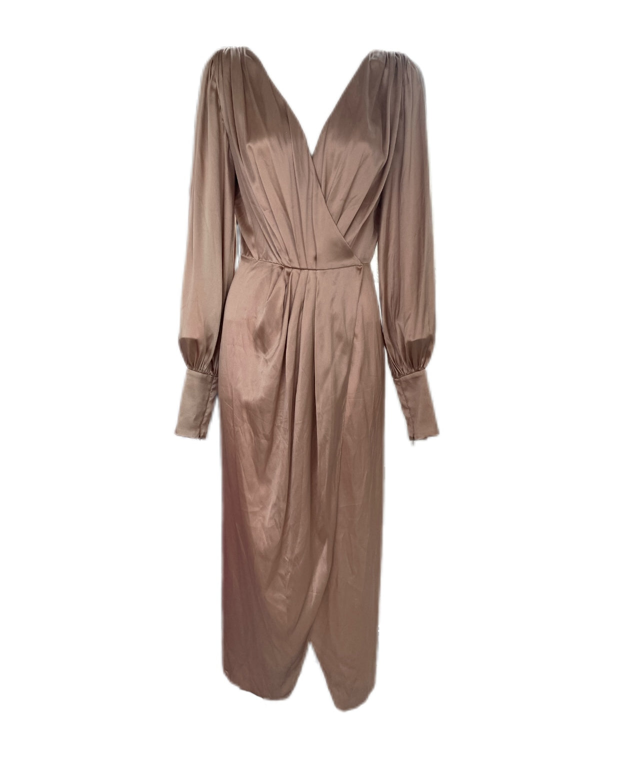 This K. Rutman satin rose gold long dress is expertly crafted from high-quality satin for a luxurious feel. The rose gold color adds a touch of elegance and the long length offers a flattering silhouette. Perfect for formal events or special occasions, this dress is a must-have for any fashion-forward individual.