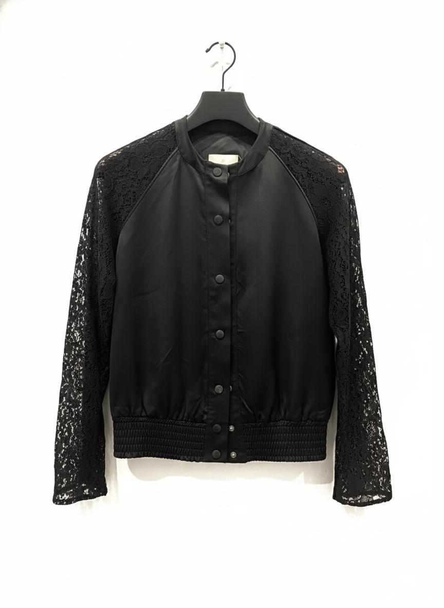 Expertly crafted for both style and comfort, the Lefon black jacket features delicate lace detailed sleeves for a touch of elegance. The sleek black design is versatile for any occasion, making it a must-have addition to your wardrobe. Upgrade your look with this sophisticated piece.