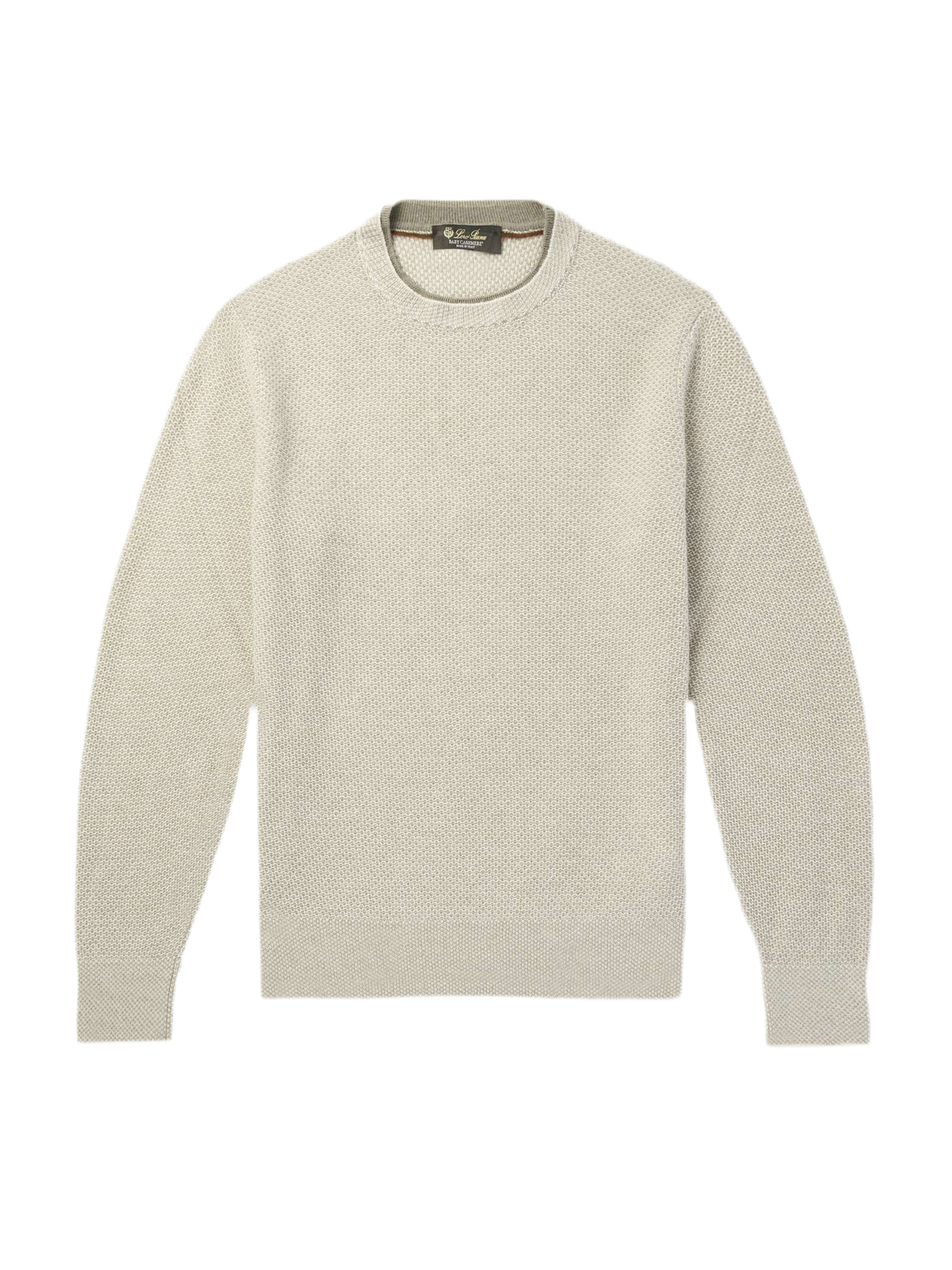 Loro Piana is renowned for its baby cashmere - an ultra-soft fibre from Capra hircus goat kids. For this sweater, the precious and exclusive resource is knitted in a two-tone honeycomb stitch that gives it a nice sense of depth.