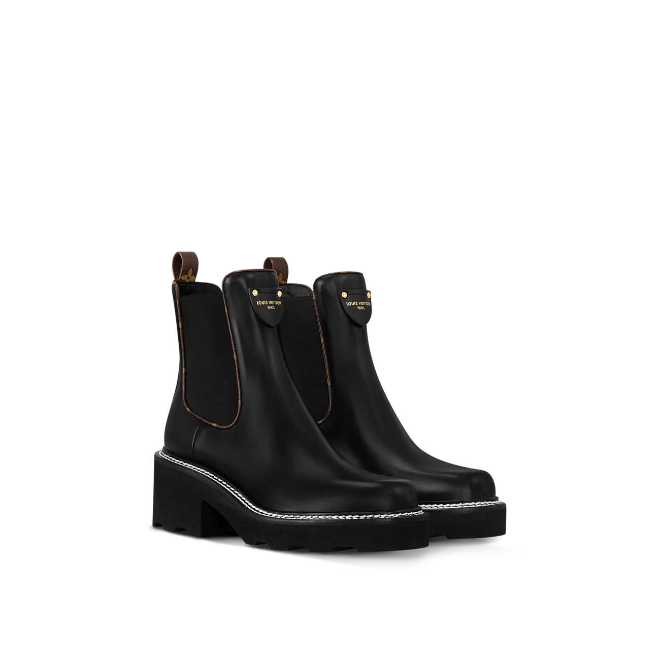 The LV Beaubourg ankle boot in black calf leather mixes masculine and feminine codes. The upper, which was inspired by Chelsea boots, is combined with a chunky yet lightweight outsole. This model features refined details, including Monogram-canvas piping around the elastic side panels and white stitching around the welt.