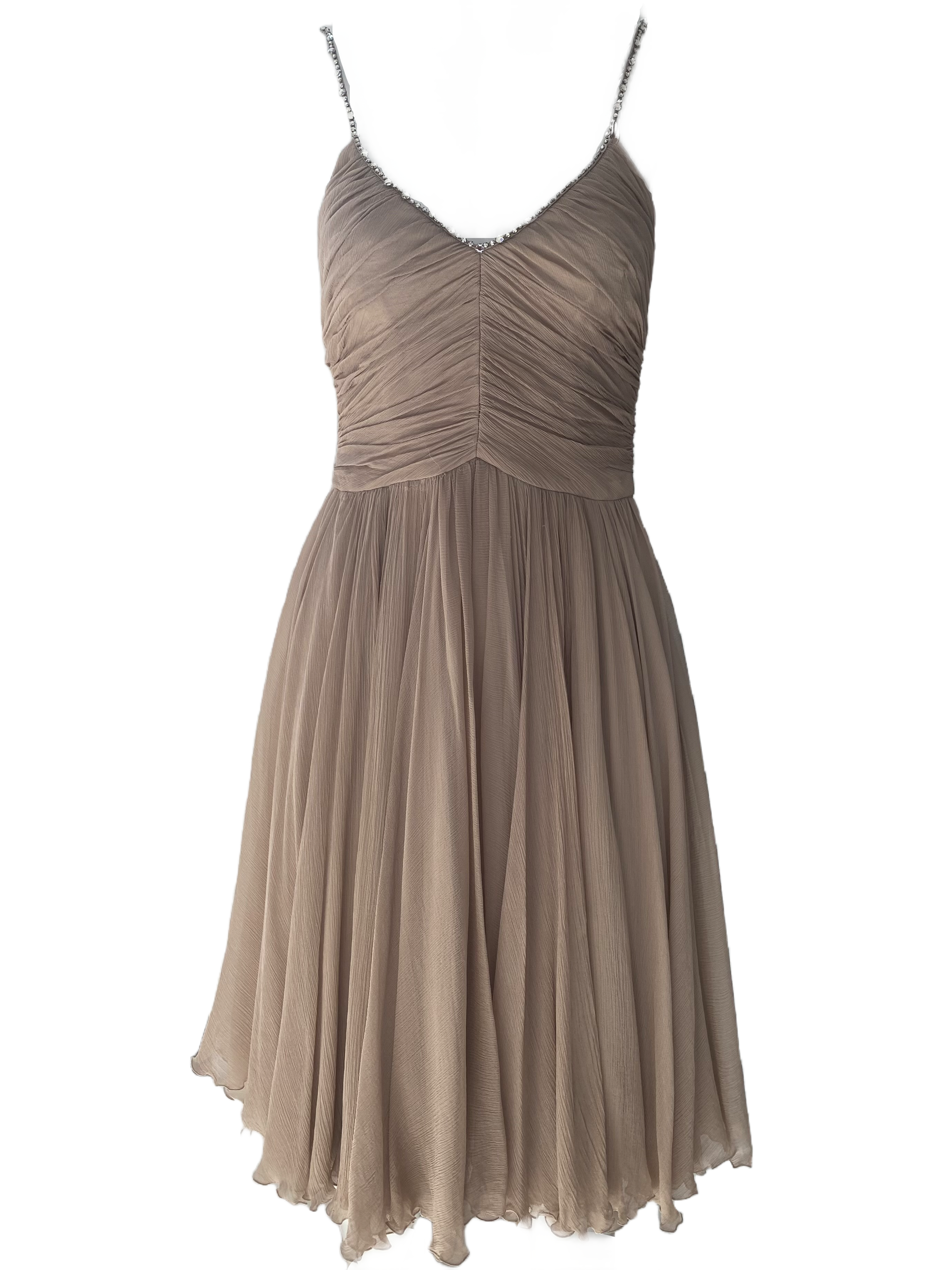 Expertly designed by Luisa Beccaria, this beige pleated dress is the epitome of elegance. The intricately pleated fabric drapes beautifully, while the fit and flare silhouette flatters any figure. Perfect for any special occasion, this dress will make you feel confident and stylish.