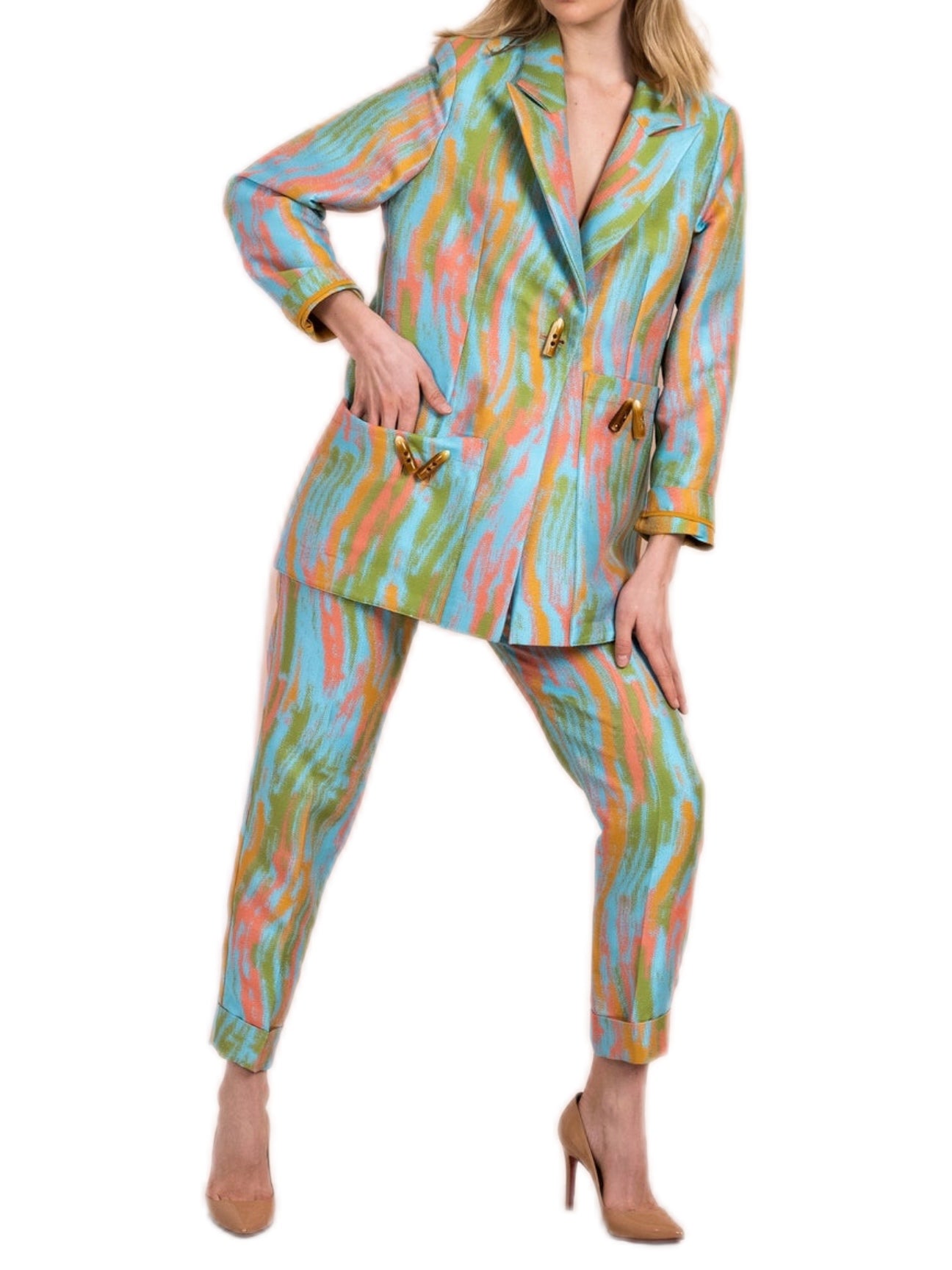 Experience the ultimate in vibrant style with the Mani Mani colorful suit. Made with high-quality materials, this suit offers eye-catching colors and a comfortable fit. Perfect for any occasion, this suit will have you standing out in the best way possible. Elevate your wardrobe with Mani Mani.