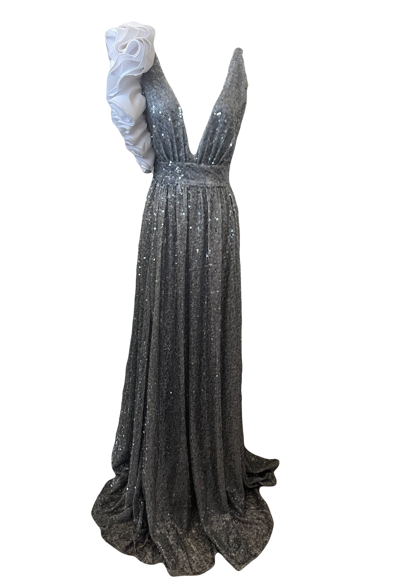 This elegant Rasario silver sequin gown dress is perfect for any formal occasion. Its exquisite design, adorned with shimmering sequins, is sure to make a statement. With its high-quality materials and expert craftsmanship, this dress will make you feel confident and glamorous. Embrace luxury and sophistication with this stunning gown.