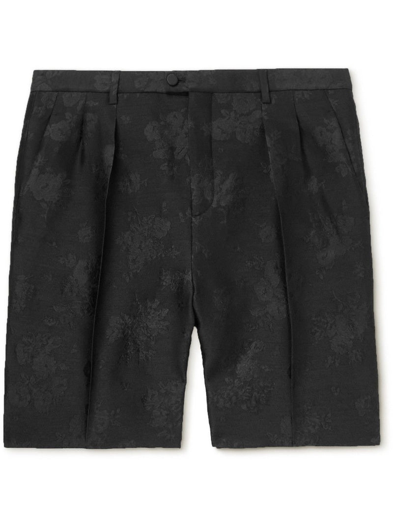 Expertly designed with a blend of wool and silk, these Saint Laurent black brocade shorts offer luxurious comfort and a sophisticated look. The pleated design adds texture and movement, while the brocade pattern adds a touch of elegance. Perfect for formal occasions or a night out.