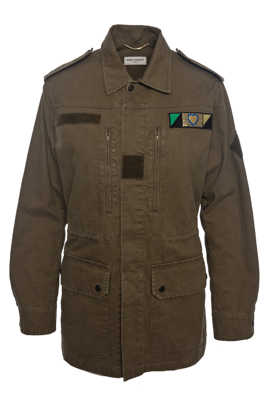 Expertly designed with a military-inspired silhouette, the Saint Laurent “Love” Khaki jacket adds a touch of both edge and elegance to your wardrobe. Made from high-quality materials, this jacket is durable and stylish, perfect for any occasion. Stay on-trend with this statement piece.