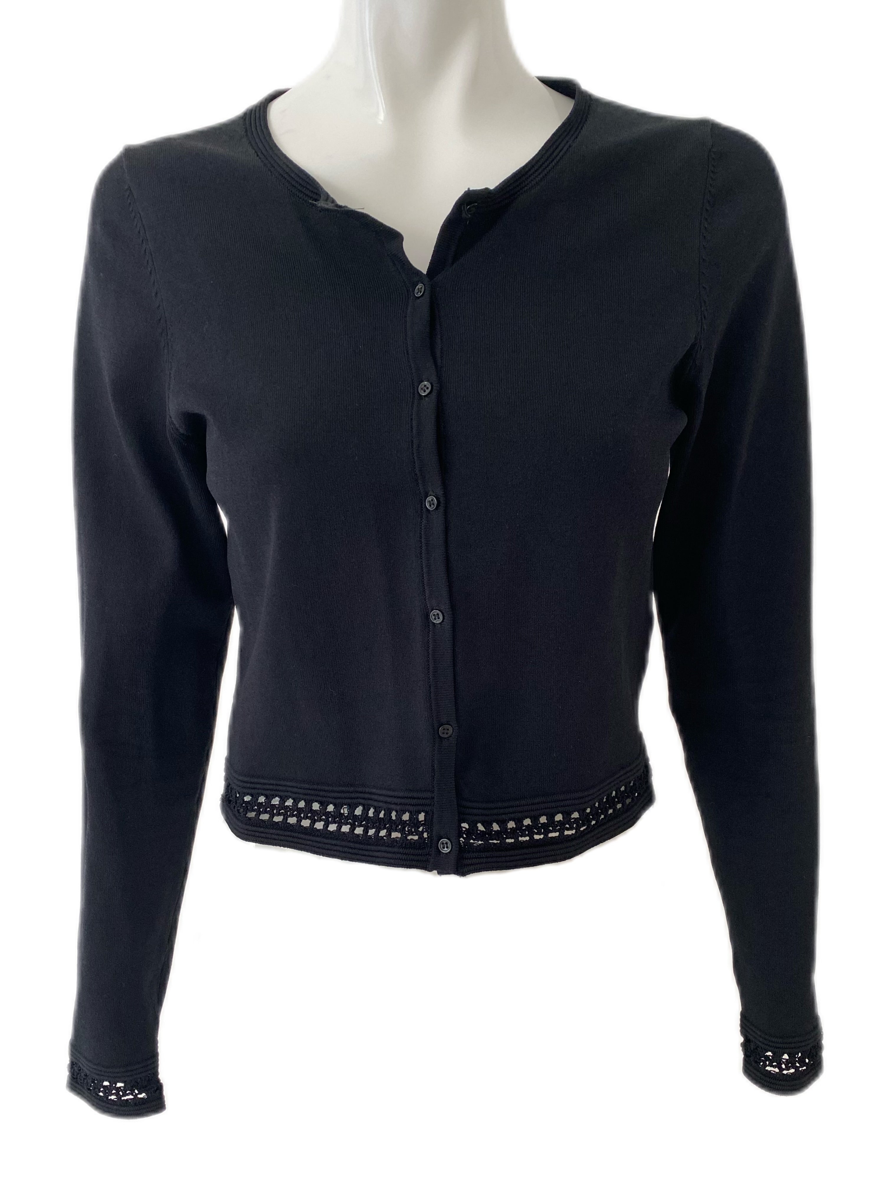 Upgrade your wardrobe with our Sandro black cardigan. This classic piece is made with high-quality materials for a comfortable and stylish fit. With a sleek black color, this cardigan is easily versatile for any occasion. Elevate your look and stay cozy with the Sandro black cardigan.