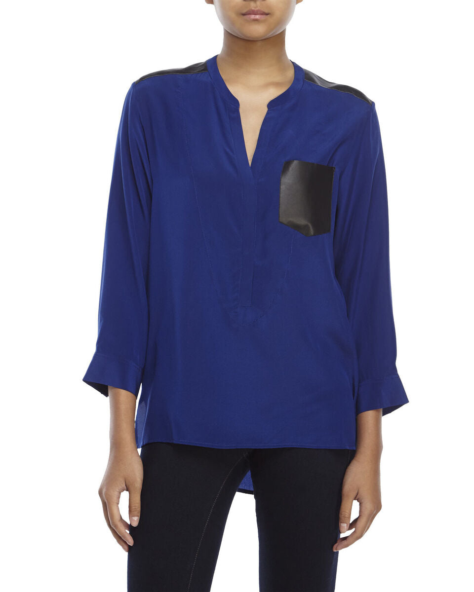 Expertly crafted from luxurious silk, the Sandro leather pocket blouse adds a touch of sophistication to any outfit. With its premium leather accents and functional pockets, this blouse combines style with practicality. Elevate your wardrobe with this timeless piece.
