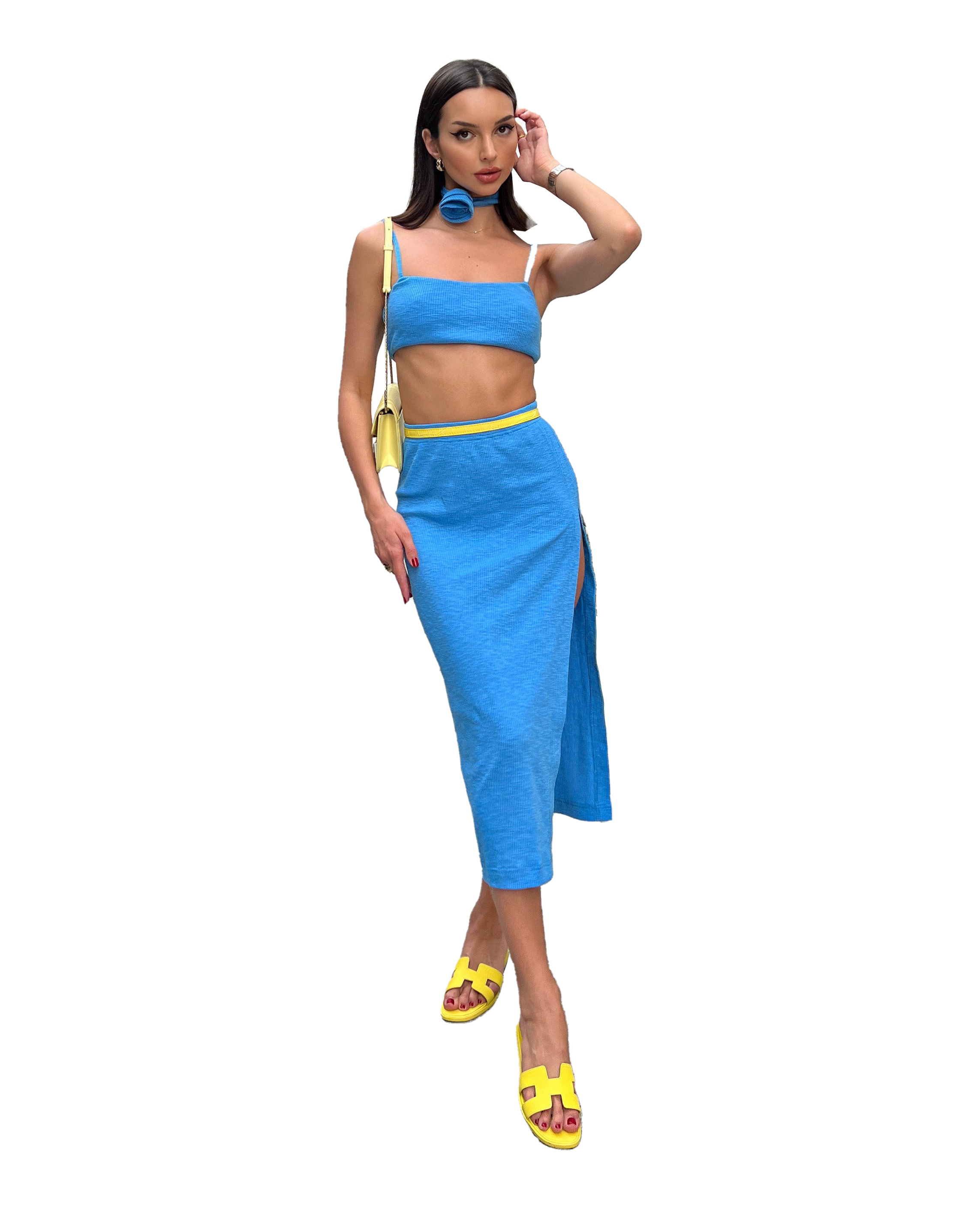This Manera Odevatca Blue Rose Set offers a stylish and versatile addition to your wardrobe. Made with high-quality fabric, it provides comfort and durability. The set includes a blue skirt and top, perfect for any occasion. Upgrade your style with this chic and trendy skirt set.