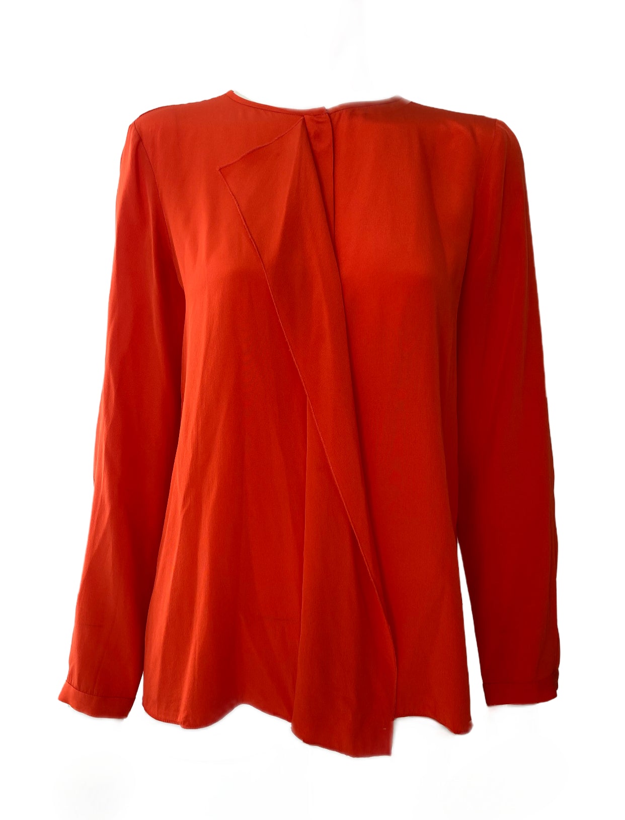 Expertly crafted from luxurious silk, this Tibi round neck orange blouse is a versatile piece that will elevate any wardrobe. With its timeless design and vibrant color, it can be dressed up or down for any occasion. It offers superior comfort and style.
