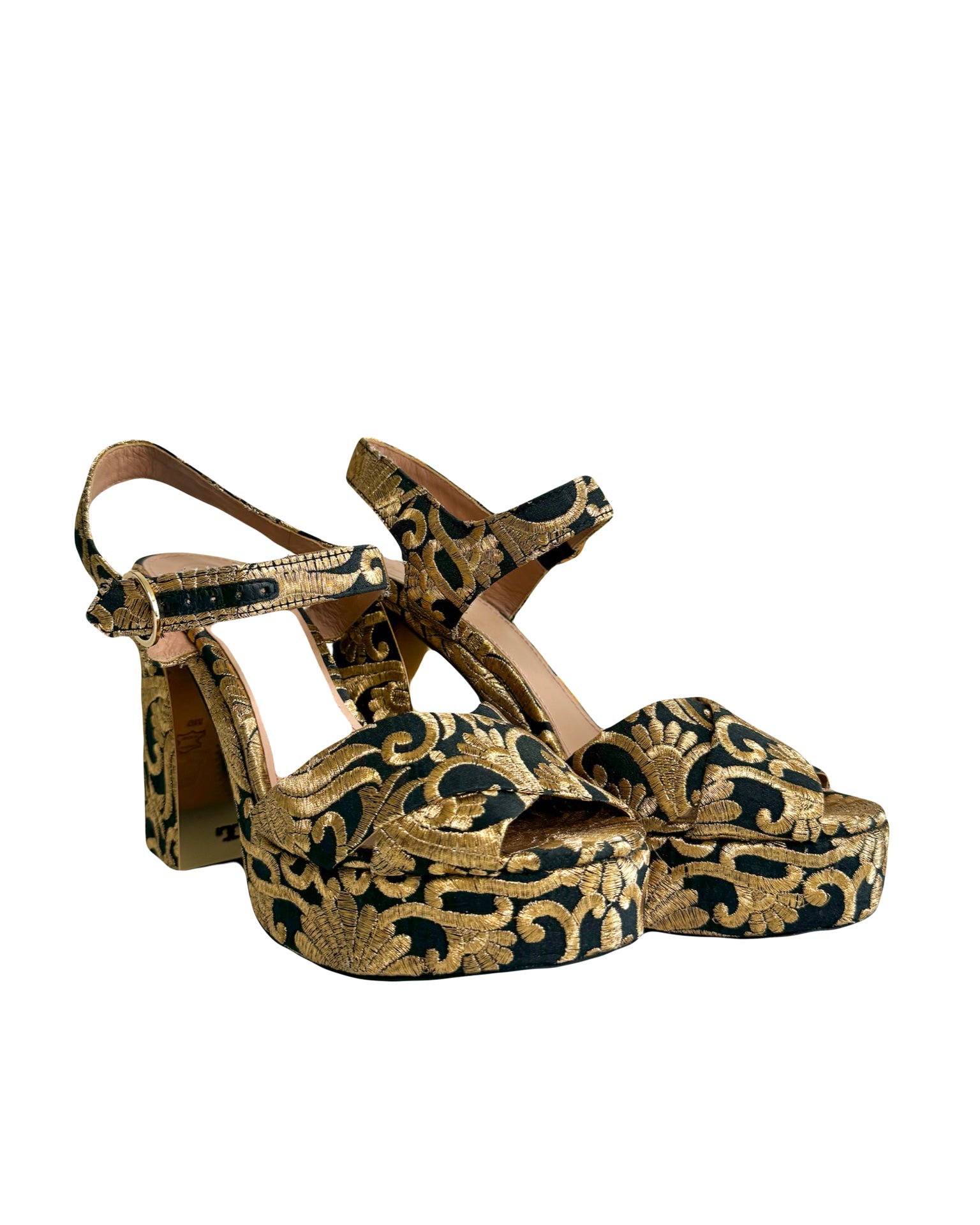 Experience luxury with the Tory Burch Black Gold Nayan Brocade Loretta heels. Beautifully crafted with black and gold brocade, these heels offer a timeless and elegant design. The perfect addition to any outfit, these heels will elevate your style while providing comfort and sophistication.