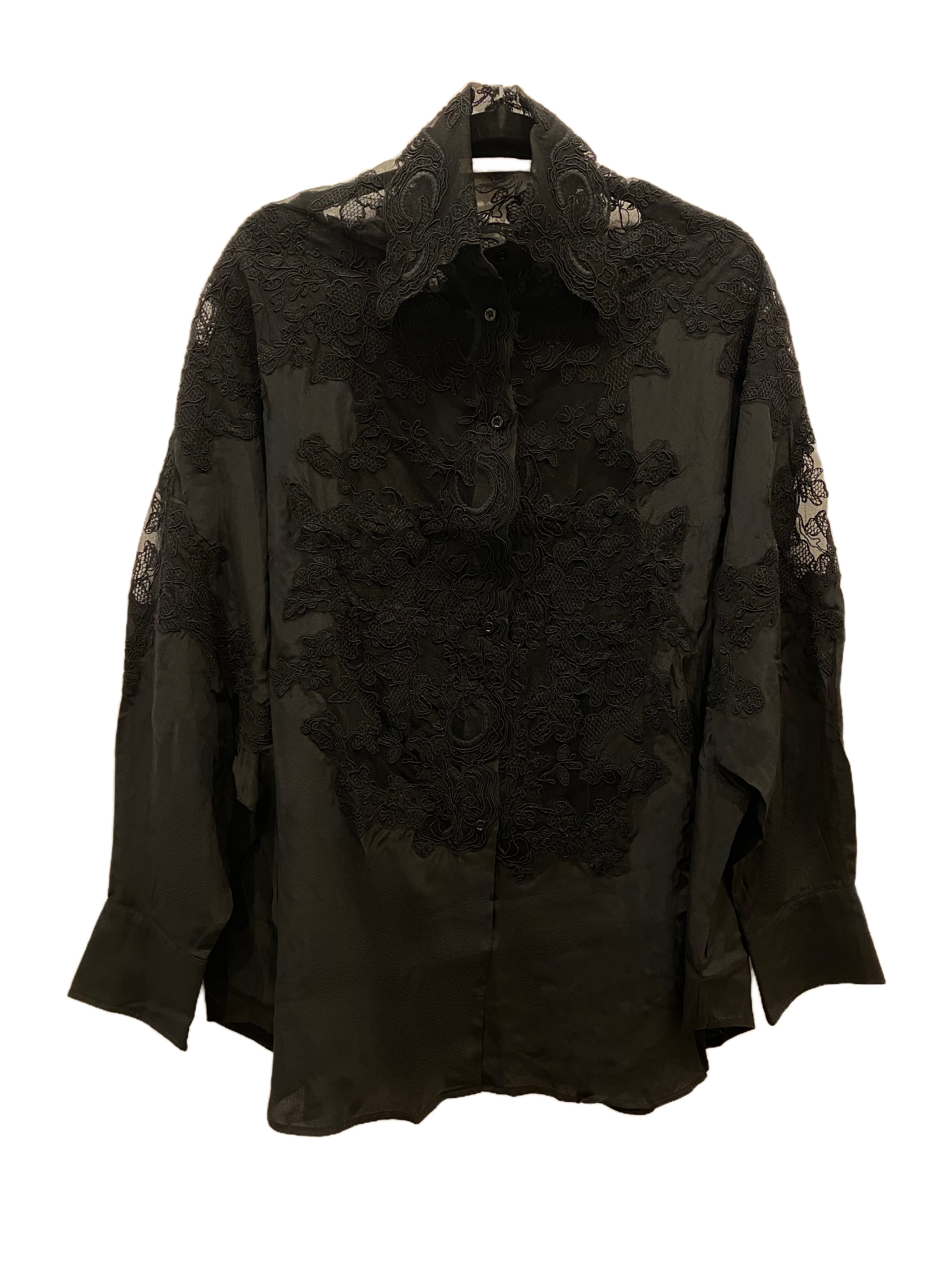 This Ermanno Scervino black lace long shirt is a stylish addition to any wardrobe. Made from high-quality lace, it features intricate detailing and a timeless design, making it perfect for both formal and casual occasions. With its elegant and versatile look, it is sure to elevate any outfit and make you stand out.