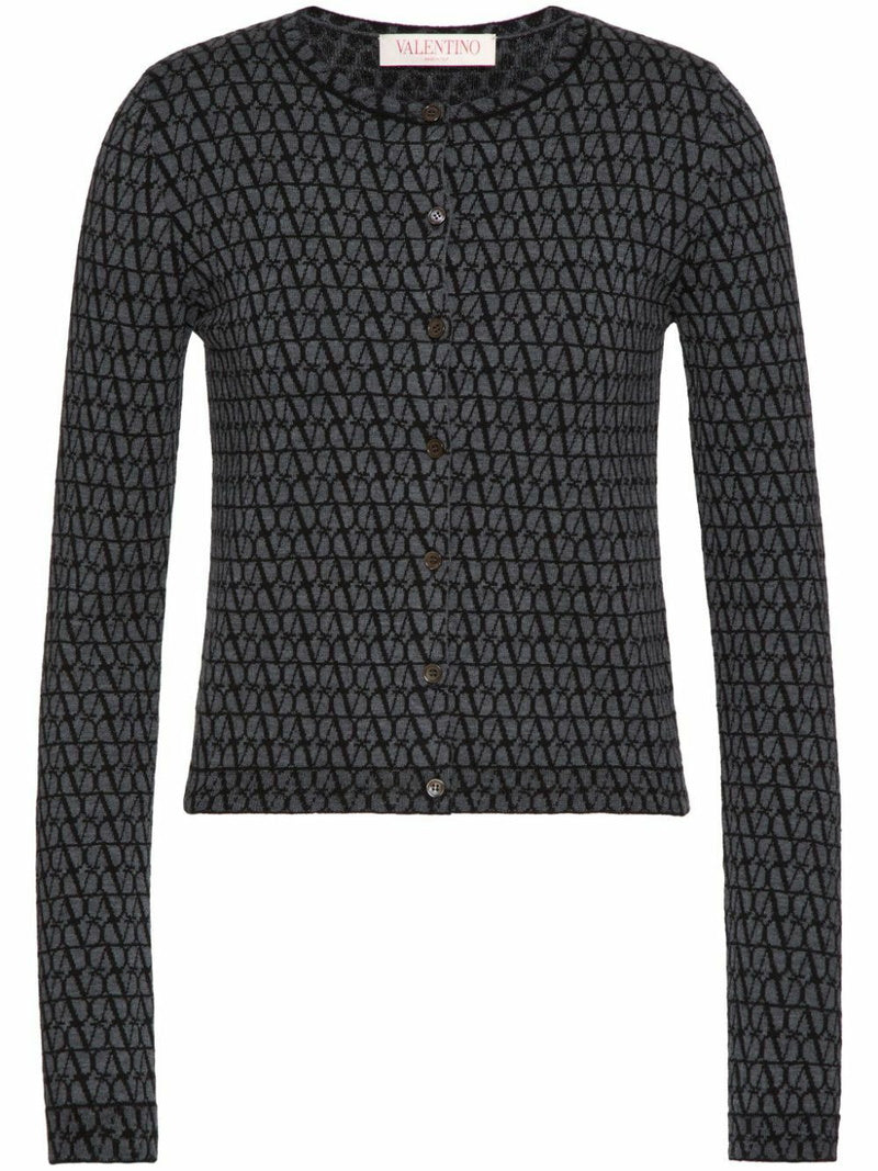 Experience luxury and sophistication with the Valentino Garavani Grey Toile Iconographe crew-neck cardigan. Crafted with expert precision, this cardigan features iconic Valentino Garavani branding on a grey toile background. Perfect for layering, it adds a touch of elegance to any outfit.